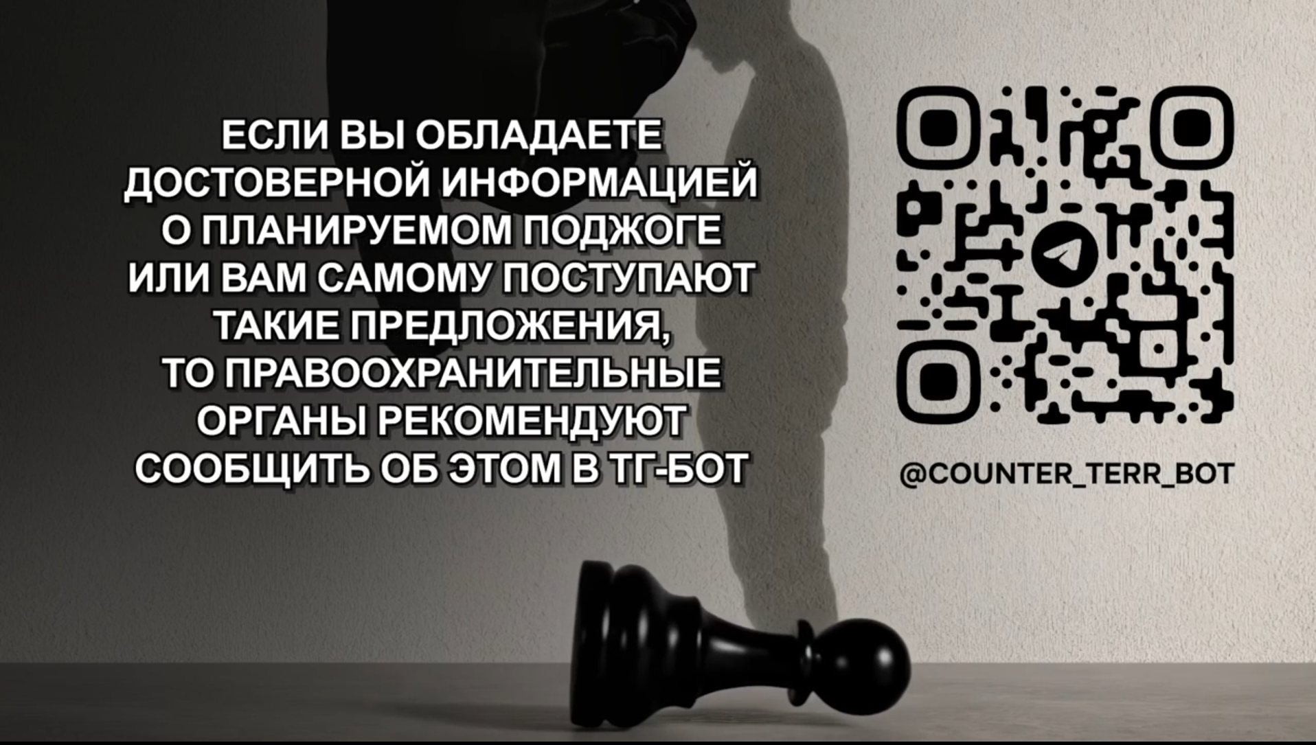 Если вы обладаете достоверной информацией о планируемом поджоге релейных шкафов, автомобилей, вышек сотовой связи, военкоматов, промышленных предприятий, административных зданий и объектов инфраструктуры или вам самому поступают такие предложения, то правоохранительные органы рекомендуют сообщить об этом в тг-бот.